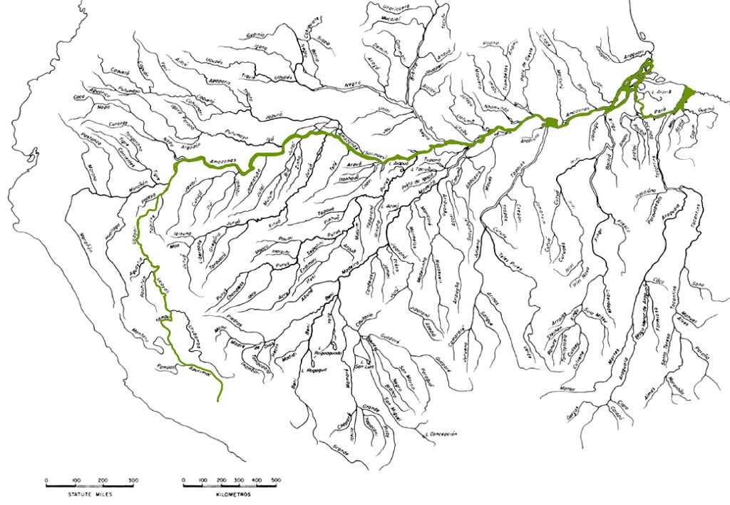 El tramo trazado en verde es la selección del recorrido a realizar, este recorrido parte de las montañas andinas, en concreto en el Nevado Mismi pasando por Atalaya y Pucallpa en el río Ucayali, por Nauta, Iquitos, Francisco de Orellana ya adentrados en el río Amazonas desde territorio Peruano llegando a la triple frontera con Leticia (Colombia), Tabatinga (Brasil) y Santa Rosa de Yavarí (Perú). La travesía continúa por el río Solimoes por Coarí y Manaos para ir llegando a Santarém, Monte Alegre, Macapá y Belén do Pará en la desembocadura del río, el gran delta que se adentra en el océano Atlántico. La cuenca del río Amazonas es la más grande del mundo y este mapa muestra la inmensidad de su alcance.