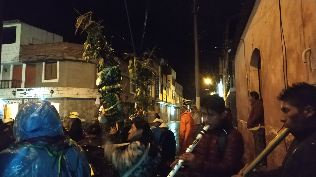Esta tradición, mantiene diferentes clanes en el pueblo, cada clan se une a la procesión desde sus barrios y es así como el ritual comienza a mediodía. A partir de ahí se comparte bebida, tanto chicha como vino dulce, durante horas acompañados de música y danzas, normalmente las mujeres bailan y los hombres tocan música. La colectividad siempre va acompañada de un aro, que es así como llaman a una especie de «totem» donde incluyen todo lo que tienen en la chacra: habas, cebollas, ají, queso, flores decorativas, plátano, uvas, limón, manzana, choclo, membrillo y que llevan consigo para honorar a los Apus y la chacra pidiendo por una buena cosecha. El evento final termina con una fiesta en casa del mayordomo/a elegido entre todxs cada año.