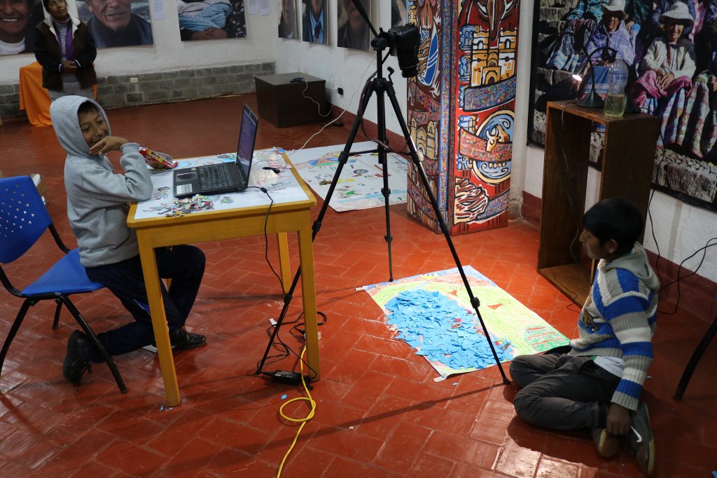 Desde el Centro Cultural Colca inician las actividades con niños y niñas de Coporaque en las cuales tuve la fortuna de participar facilitando unos espacios. Por un lado, se entretejía con un taller de fotografía y animación facilitado por Vicky Arias y Edward de Ybarra (BULLA Asociación Cultural). Partiendo del corazón del «ser imagen», crearon cámaras obscuras para experimentar desde la creación de fotografía analógica continuado de técnicas de animación diversas.