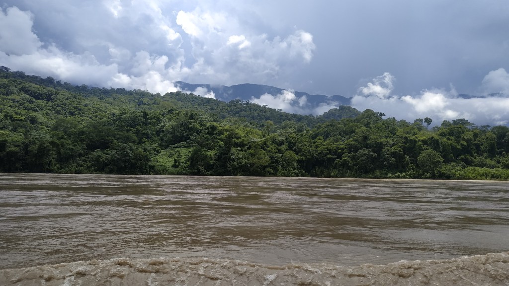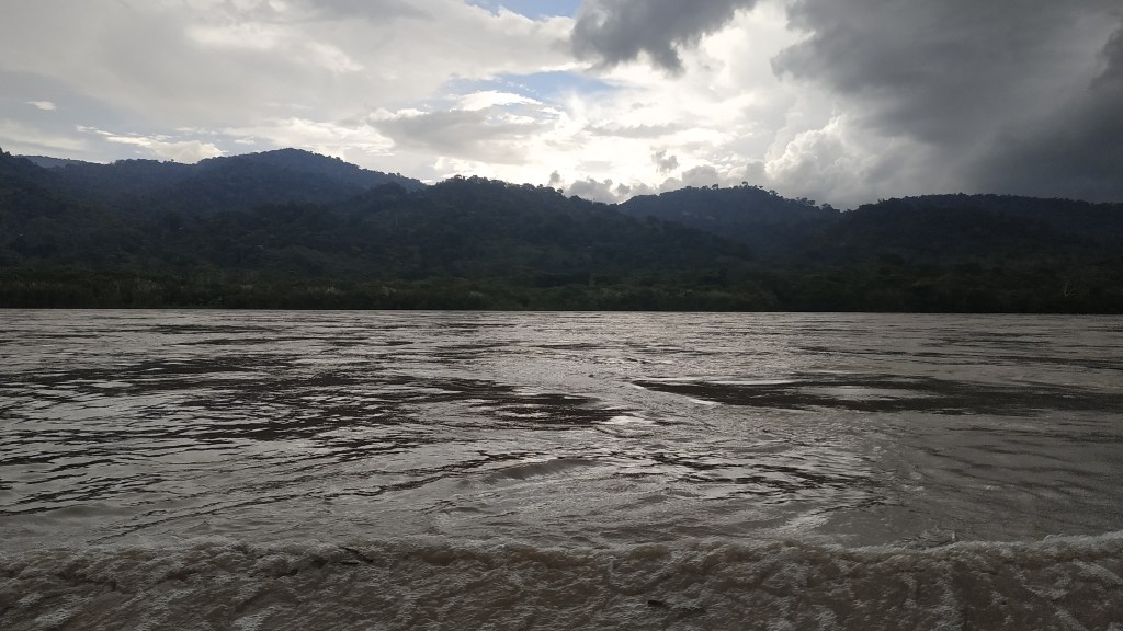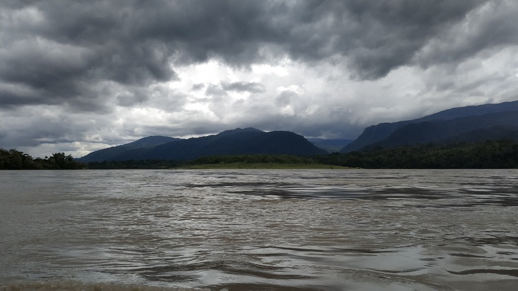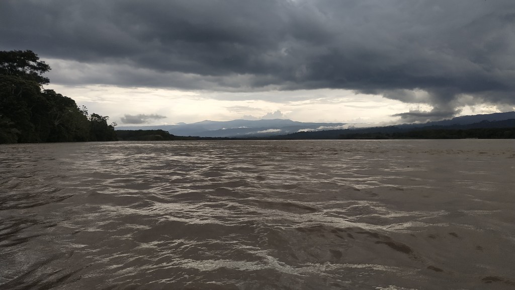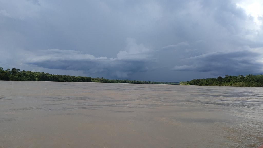 La travesía en barco fluyó a través del río Tambo, el nombre que recibe el río a esta altura, a pesar que seguro tiene otros nombres en otras lenguas originarias que desconozco por ahora. Lo primero que recuerdo al pensar en esta travesía es una historia que me contaban sobre la época de lluvias en la Amazonía, me decían que en estas épocas no existe familia en las comunidades amazónicas, con eso se referían a que si el familiar esta cerca estará presente pero si vive lejos es como si no existiera, en el sentido de que no se puede visitar en estas épocas ya que el río se vuelve bravo y por lo tanto peligroso. Y así fue cómo lo sentí desde este viaje, un flotar convulso y cambiante, donde cada tormenta aparecía sin avisar, llegando con la mayor intensidad que se puede sentir desde el río, o así lo sentí, ya que el barco pasaba de tener un vaivén tranquilo y rítmico como si de una mecedora se tratase a ser abordado por olas voraces acompañadas de fuertes lluvias con rayos y truenos. Sin duda momentos a recordar, donde la naturaleza Amazónica mostró su exaltación enérgica al máximo esplendor. En el barco se sentía miedo, todxs nos pusimos los chalecos salvavidas, los cuales no se nos habían facilitado pero estaban ahí, colgados del techo del barco. El barco, estrecho y alargado, fue en un momento embestido por una ola provocada por la tormenta, la cual viniendo de lado hizo que el barco se llenara de agua en su interior, se oyeron gritos y demandas de una conducción más cautelosa en estas circunstancias climáticas.