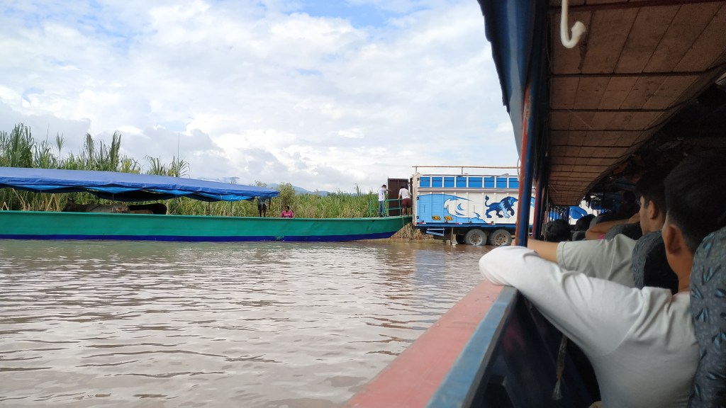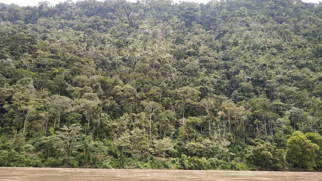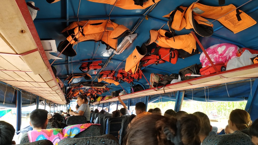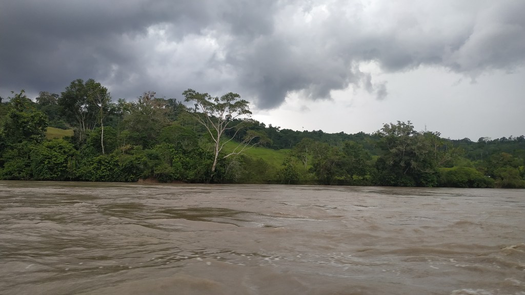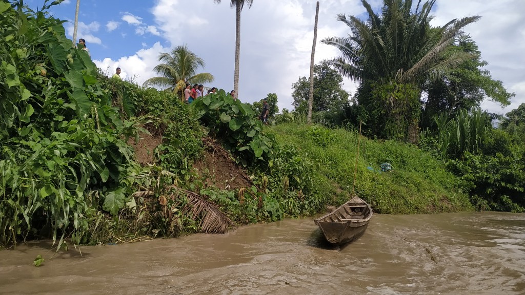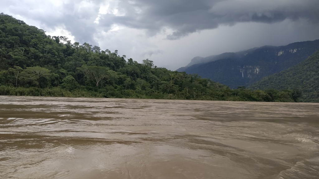 La travesía en barco fluyó a través del río Tambo, el nombre que recibe el río a esta altura, a pesar que seguro tiene otros nombres en otras lenguas originarias que desconozco por ahora. Lo primero que recuerdo al pensar en esta travesía es una historia que me contaban sobre la época de lluvias en la Amazonía, me decían que en estas épocas no existe familia en las comunidades amazónicas, con eso se referían a que si el familiar esta cerca estará presente pero si vive lejos es como si no existiera, en el sentido de que no se puede visitar en estas épocas ya que el río se vuelve bravo y por lo tanto peligroso. Y así fue cómo lo sentí desde este viaje, un flotar convulso y cambiante, donde cada tormenta aparecía sin avisar, llegando con la mayor intensidad que se puede sentir desde el río, o así lo sentí, ya que el barco pasaba de tener un vaivén tranquilo y rítmico como si de una mecedora se tratase a ser abordado por olas voraces acompañadas de fuertes lluvias con rayos y truenos. Sin duda momentos a recordar, donde la naturaleza Amazónica mostró su exaltación enérgica al máximo esplendor. En el barco se sentía miedo, todxs nos pusimos los chalecos salvavidas, los cuales no se nos habían facilitado pero estaban ahí, colgados del techo del barco. El barco, estrecho y alargado, fue en un momento embestido por una ola provocada por la tormenta, la cual viniendo de lado hizo que el barco se llenara de agua en su interior, se oyeron gritos y demandas de una conducción más cautelosa en estas circunstancias climáticas.