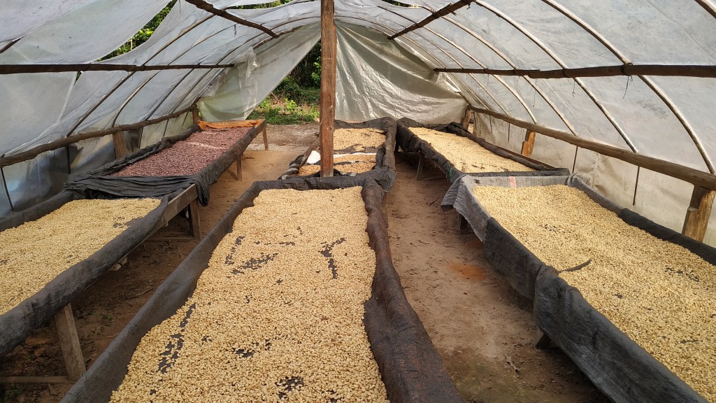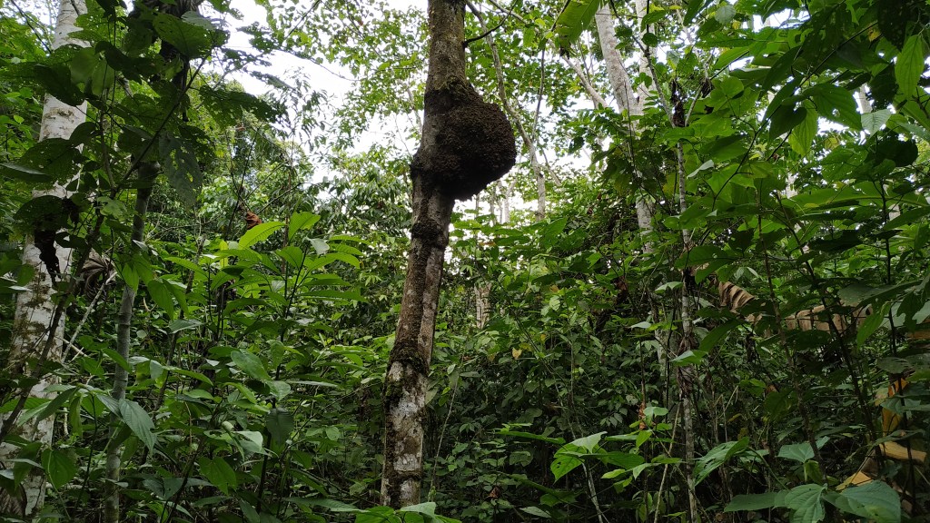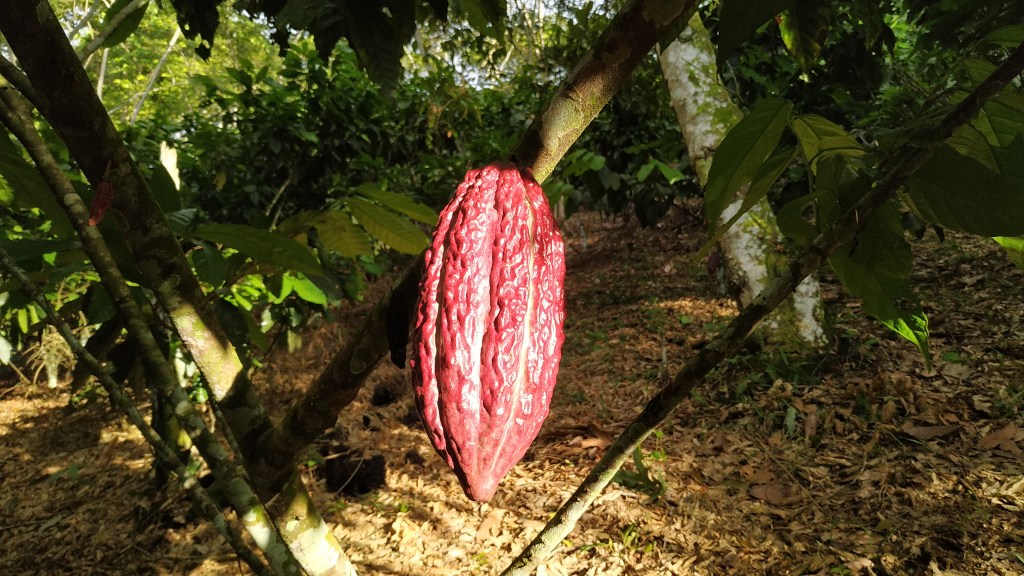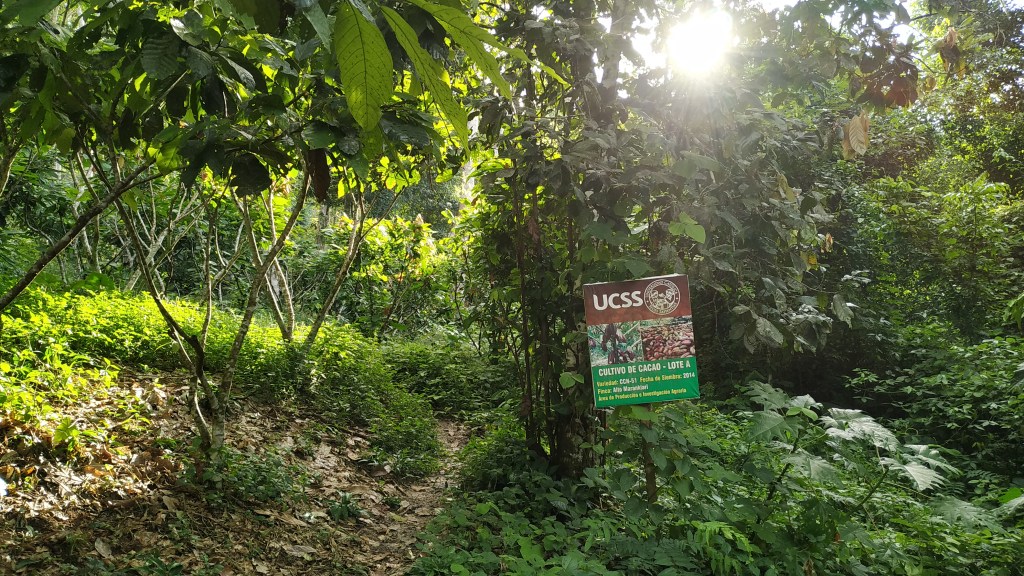 En la foto nos encontramos en una plantación de cacao y café principalmente, propiedad de la universidad, donde lxs estudiantes pueden ir a trabajar en el día sábado para aprender de labores de cultivo y contribuir al sistema productivo de la universidad, muchas gracias a Julio Cesar por su excelente visita guiada. Al fondo se puede ver el nacimiento del río Ucayali como resultado de la unión entre el río Urubamba y Tambo.
