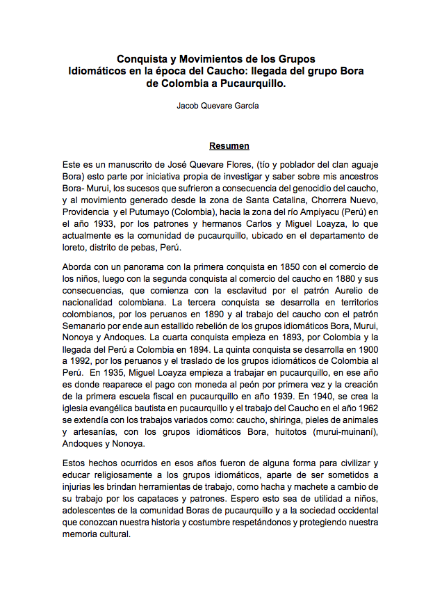 Jacob Quevare García nos ha compartido una parte de su investigación sobre la cultura de su comunidad Bora en Pucaurquillo (Perú), descrita en palabras por él mismo para acercarnos a su historia. Agradecerle infinitamente el tiempo compartido en Pucallpa, con todos sus aprendizajes, remarcando su compromiso, bondad e infinita creatividad.