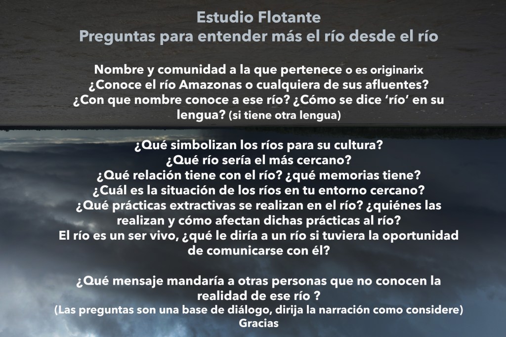 Estudio Flotante cuando el río suena a Amazonas es un proyecto que nació en el río Amazonas para ser desarrollado en su curso. Una búsqueda desde el arte que aborda un diálogo de saberes desde el aprendizaje relacional y situado. El objetivo es entablar diálogo con el río desde estar en el río, conociendo la vida de este cuerpo de agua, desde su nacimiento hasta la desembocadura. Sin embargo, debido a la pandemia no fue posible continuar y es así que el proyecto ha tomado diferentes ramificaciones y colaboraciones basadas en vínculos creados en el río en la Amazonía Peruana.